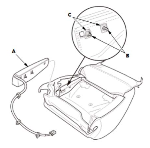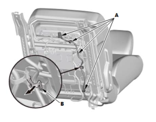 1.从座垫下松开座垫骨架弹簧的弹性带。 2.拆下卡扣 (A)。 3.向前弯曲钩(B)拆下线束。 4.拆下前排座椅靠背护面/软垫。 |