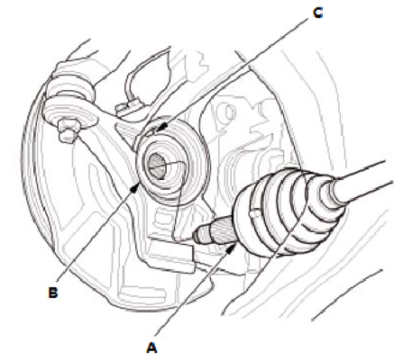 2.将外球笼(A) 安装到转向节上的前轮毂(B)中。