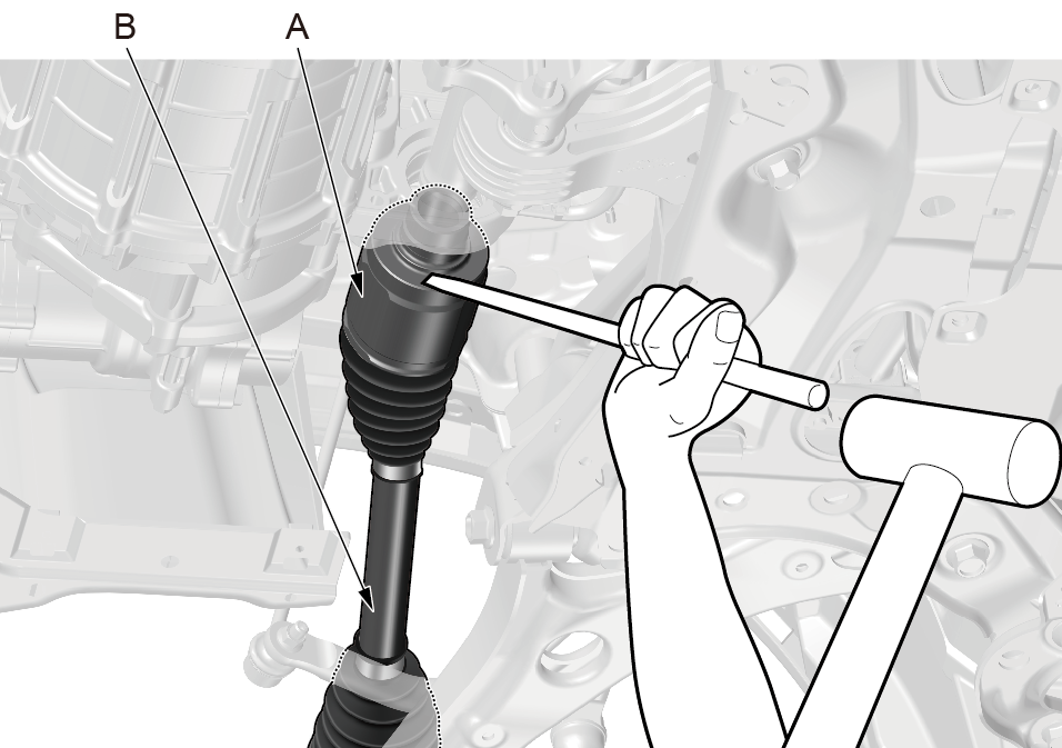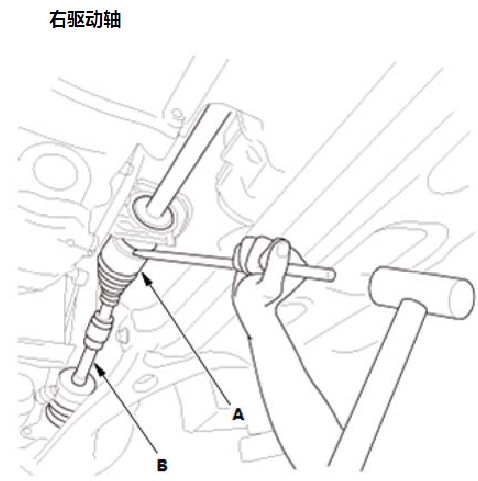 3.右驱动轴:用冲子和锤子使内万向节(A) 脱离中间轴。 4.右驱动轴:将驱动轴整体拆下。