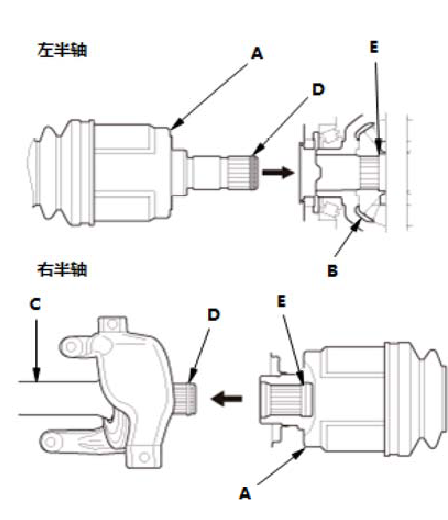4.用压缩空气将驱动轴与差速器的接触部位吹干。 5.将驱动轴的内万向节端部 (A)插入差速器 (B) 或中间轴(C),直到固定环(D)卡在环槽 (E)中。