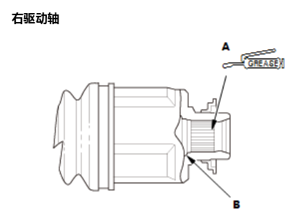 1.右驱动轴:将0.5- 1.0 g (0.018 - 0.035 oz)钼基润滑脂涂抹到右驱动轴的整个花键表面(A)上。. 2.右驱动轴:涂抹完润滑脂后,每隔2 -3个花键,清除花键凹槽和固定环环槽(B)中的润滑脂,以使空气可以从中间轴排出。 |