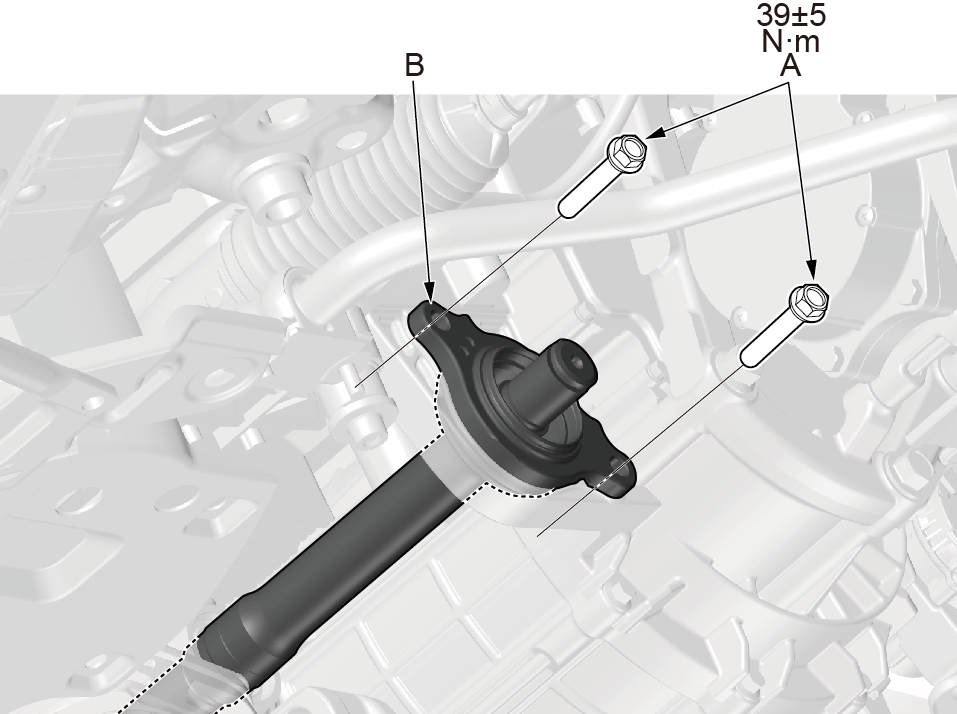 1.使用 14mm 套筒扳手拆卸中间轴固定螺栓(A)。 2.使用半轴拆卸工具配合惯性拉拔器拆卸中间轴