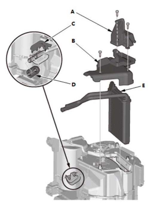 1. 拆下驾驶员侧加热器风管 (A)。 2. 拆下加热器芯盖(B)。 3. 拆下加热器管托架 (C)。 4. 拆下密封圈 (D)。 5. 拆下加热器芯 (E)。 |