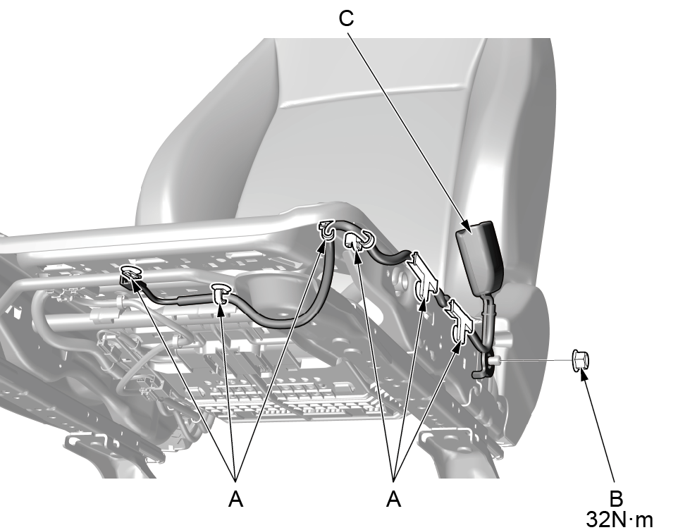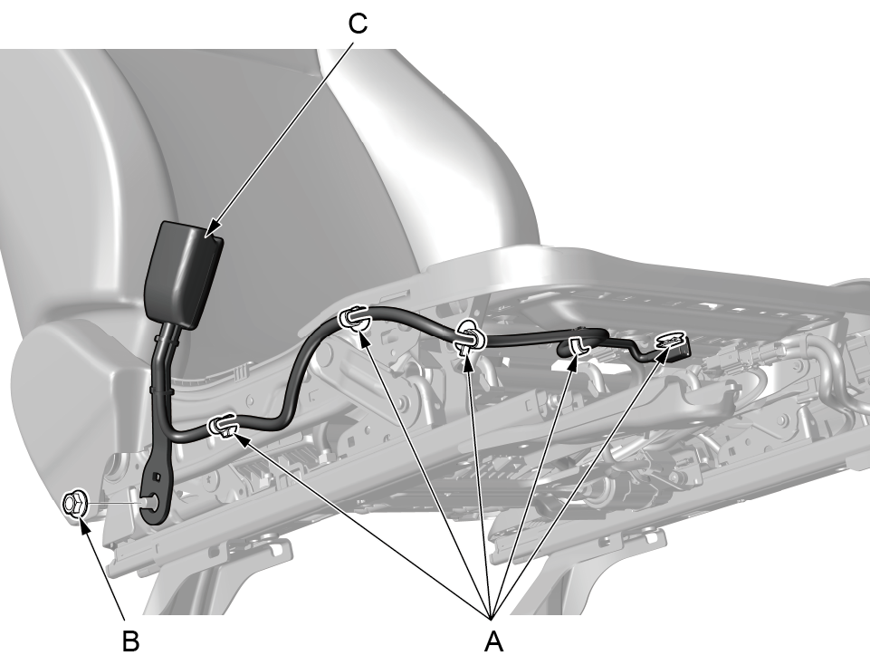 1. 脱开6个线束卡(A)。 2. 用 17mm 套筒拆卸螺母(B),取下乘客座椅 安全带搭扣(C)。