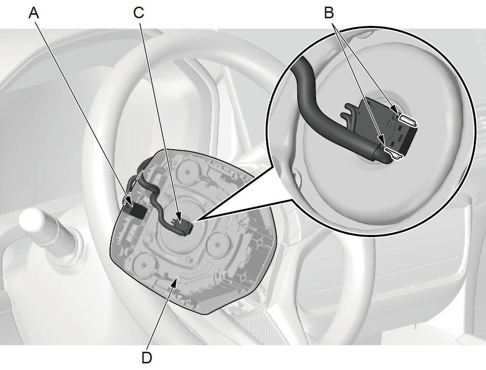 2.脱开插接器(A)。 3.拉起两个锁止凸舌(B)以脱开插接器(C)。 4.取下驾驶员气囊(D)。