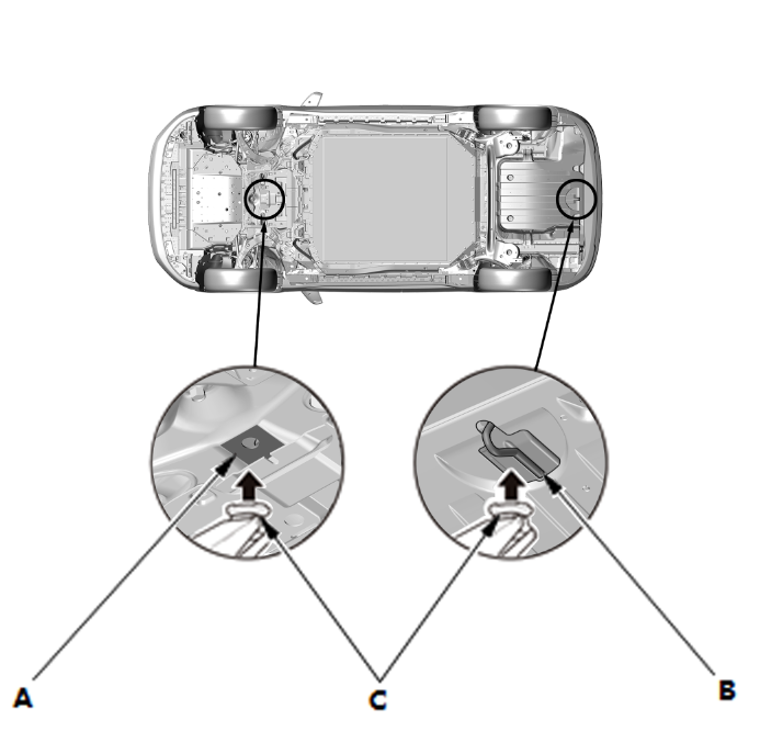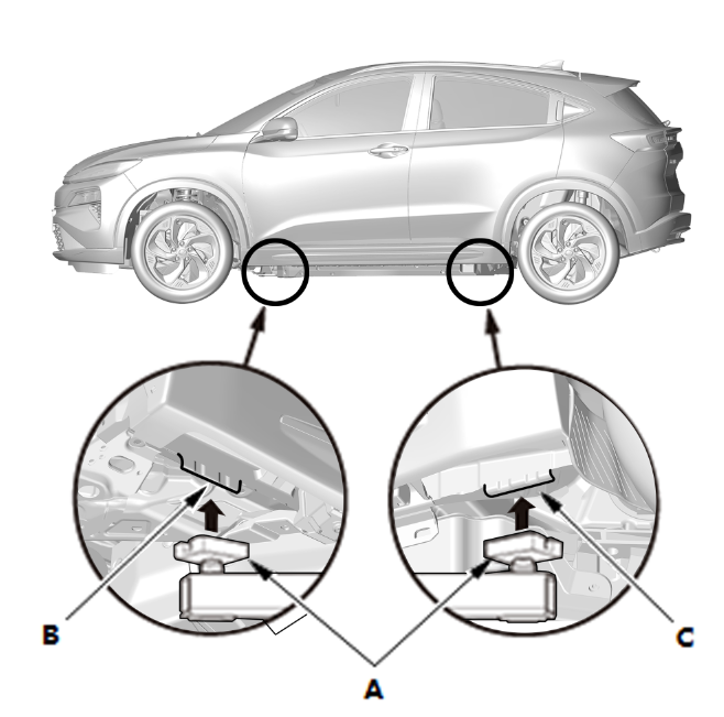 1.将举升盘(A) 置于车辆的前支撑点(B) 和后支撑点(C) 之下。