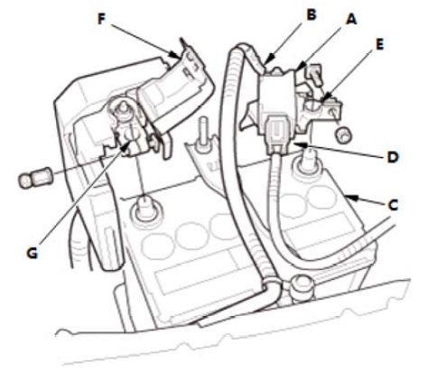 1.确保车辆处于OFF(LOCK)模式。 2.从12V蓄电池(C)上断开并隔离12V蓄电池传感器(A)的电缆(B)。