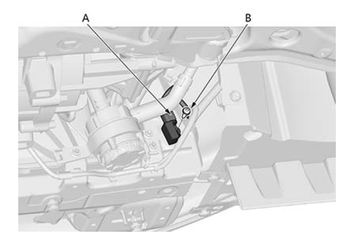 1.将前碰撞传感器安装到白车身上,使用T30套筒扳 手安装前碰撞传感器固定螺栓(B),拧紧力矩为9±3 N•M。 2.安装前碰撞传感器插接器(A)。 |