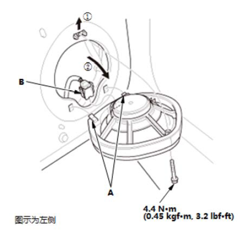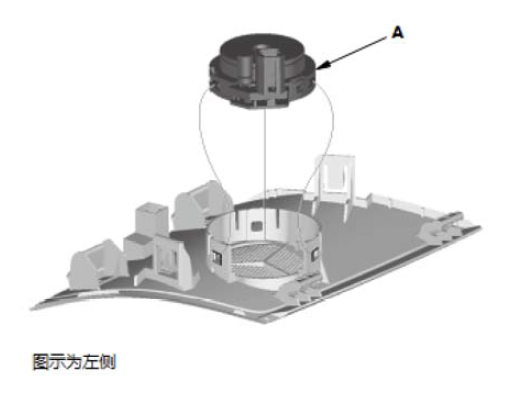 1.拆下螺栓,然后笔直向上提起车门扬声器以松开下卡扣(A)。