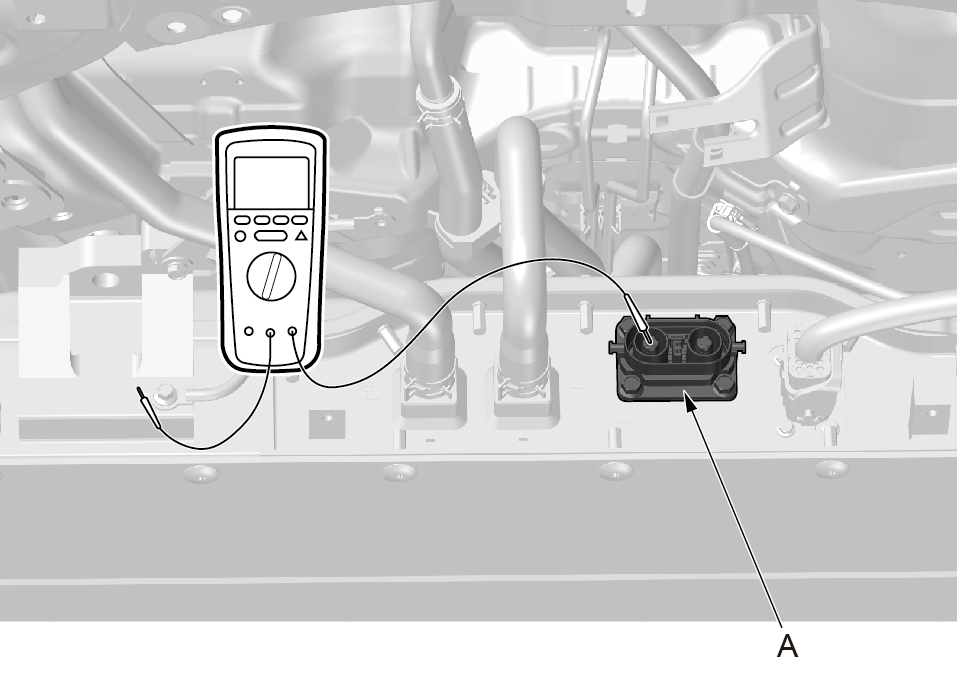 1.使用绝缘电阻检测表测量动力电池包高压电缆插头(A)与动力电池包壳体之间的绝缘电阻。将检测探头正极与电缆插头连接,检测探头负极与动力电池包壳体(非绝缘涂层)连接,观察测量值是否大于20MΩ。