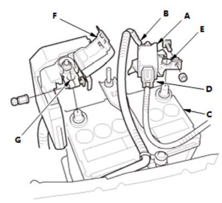 3.打开盖(F)。 4.从12 V 蓄电池上断开正极端子 (G)。