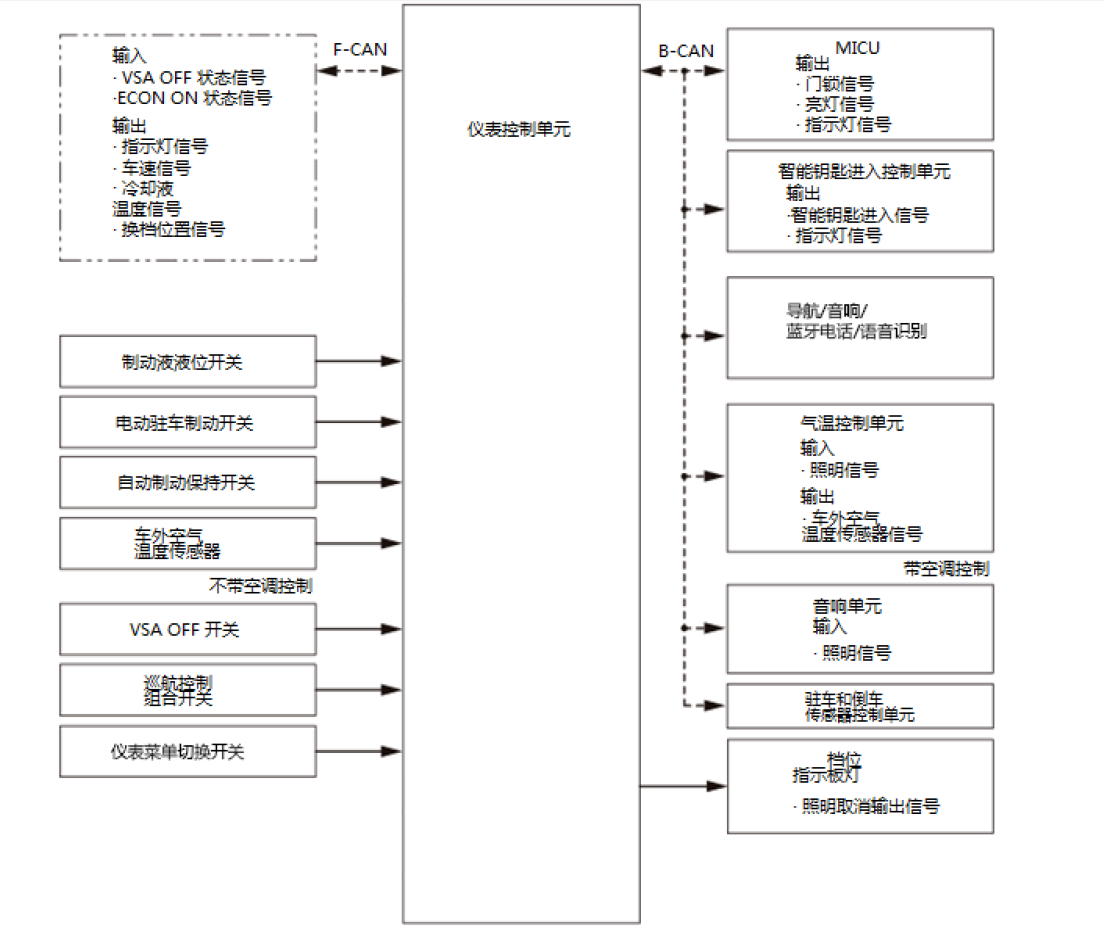 仪表控制单元通过F-CAN 和 B-CAN 从各控制单元接收信息,使指示灯点亮或闪烁。电子驻车制动开关、VSA OFF 开关、巡航控制组合开关、菜单切换开关、制动液液位开关直接连接至仪表控制单元。仪表控制单元通过B-CAN 从MICU 接收转向信号指示灯信号,并激活转向信号指示灯。