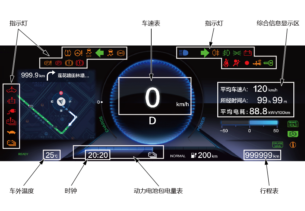 仪表控制单元是全液晶屏界面,有车速表、POWER/CHARGE表、换挡位置指示灯和其它指示灯,同时还显示导航/音响/蓝牙电话/语音识别信息以及综合信息,可通知驾驶员车辆各状态信息。