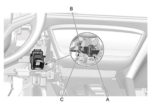 1.拉出湿度/车内温度传感器 (A),断开连接器 (B) 和吸气器软管 (C)。