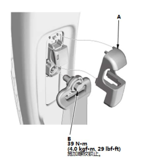 1.拆下前排座椅安全带上锚定器盖(A)。