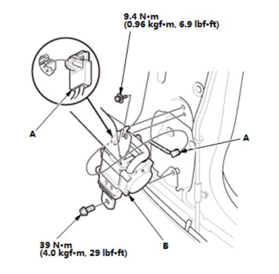 2.拆下前排座椅安全带上锚定器螺栓 (B)。