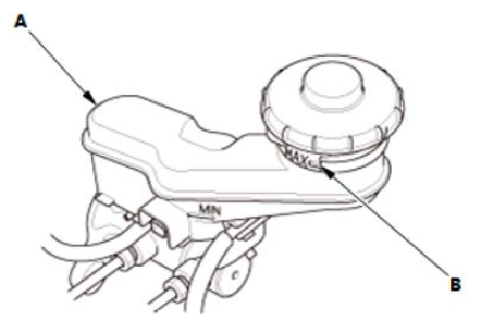 1.确保储液罐 (A) 中的制动液液位在 MAX(上)液位线(B)处。 |