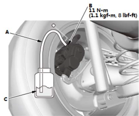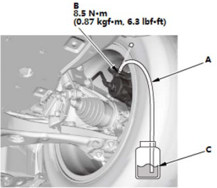 3.将一段干净的排气管 (A) 连接到放气螺钉(B) 上。 4.将排气管的另一端浸入盛有制动液 (C) 的干净塑料集油瓶中。 5.让助手缓慢地泵压制动踏板数次,然后施加稳定的连续压力。 6.慢慢松开放气螺钉,将制动液泵入塑料集油瓶中。由于从系统中抽出油液,制动踏板将向地板移动。 7.制动踏板到达地板时,让助手将踏板保持在该位置,然后紧固放气螺钉。现在可松开制动踏板。