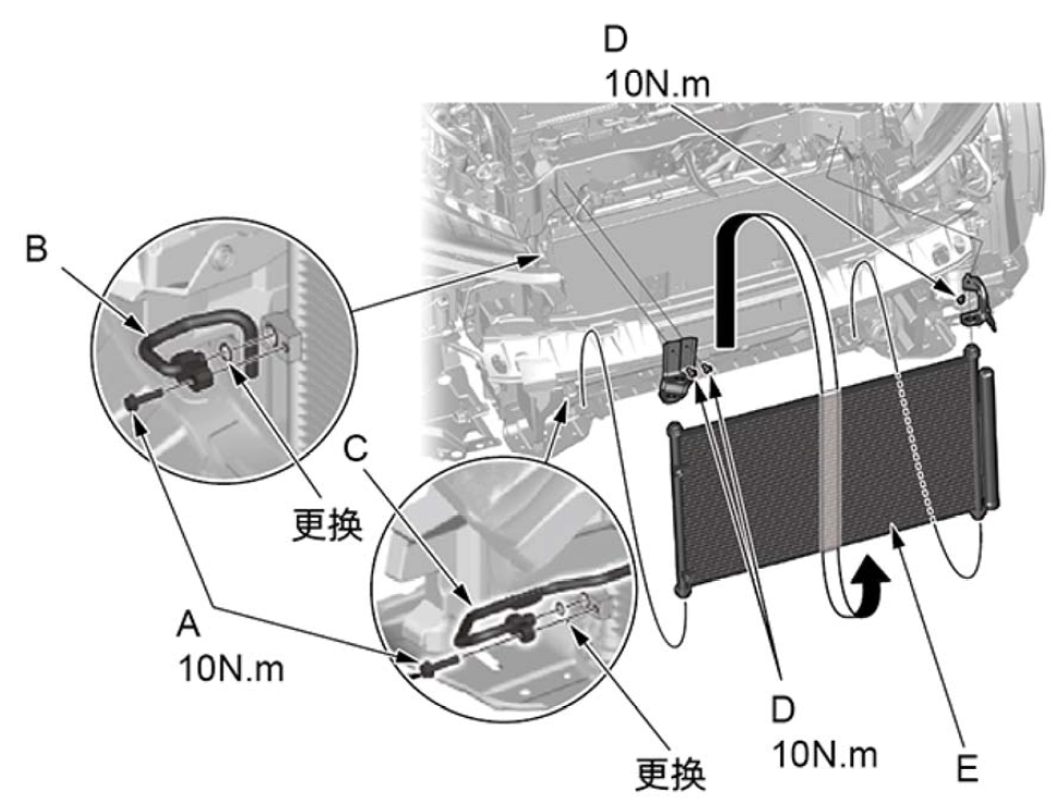 1.使用10mm套筒拆卸空调冷凝器管路固定螺栓(A)(M8×25),脱开空调冷凝器低压管(B)和空调冷凝器低压管(C)。