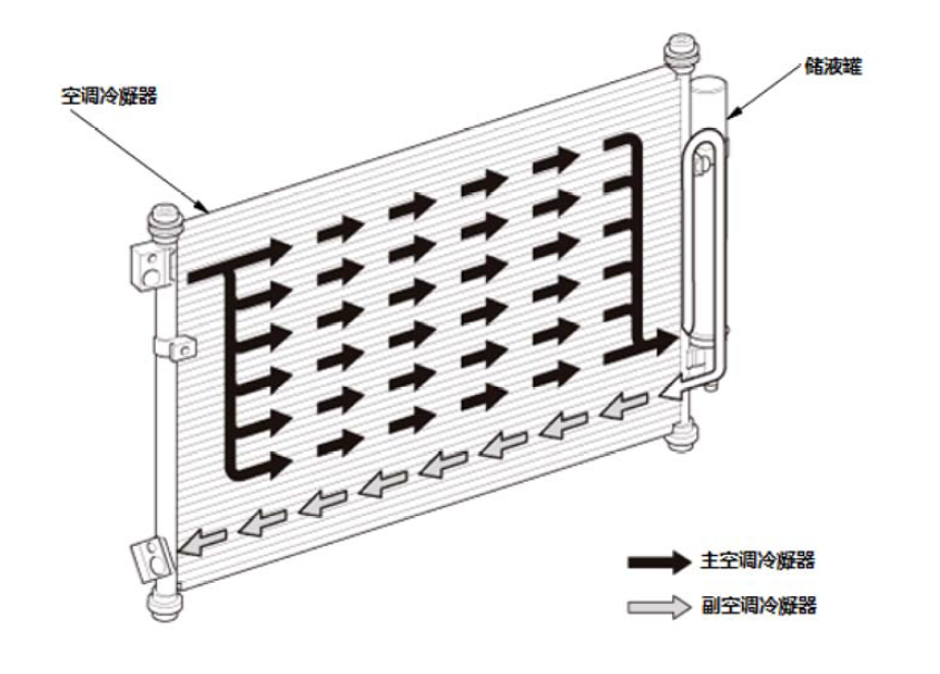 冷凝器和储液器/干燥器是集成一体的。主空调冷凝器将空调压缩机的高压及高温制冷剂蒸汽转变为高压及高温液体。这使制冷剂能够将热量释放到车外空气中。储液器/干燥器用作膨胀阀的液体制冷剂储液罐。它还可去除制冷剂杂质和湿气。子空调冷凝器冷却高压及高温液体制冷剂,以进一步改善空调性能。