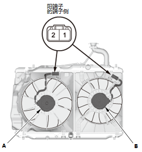 1.将插接器从散热器风扇电机(A) 和空调冷凝器风扇电机(B)上断开。 2.通过将12伏蓄电池电源连接到1号端子、将搭铁连接到2号端子,测试每个电机。 3.如果电机不运转或者运转不平稳,则予以更换。 |