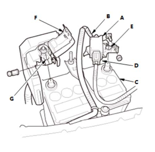 4.打开盖(F)。 5.从12 V 蓄电池上断开正极端子 (G)。 |