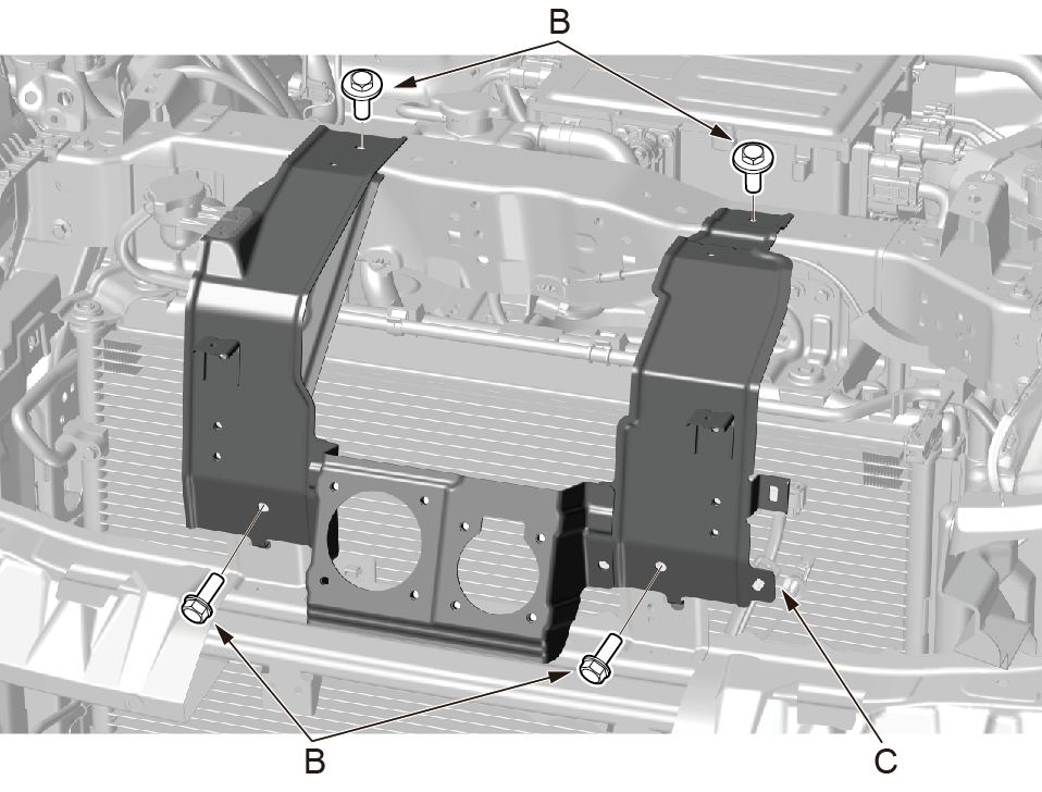 2.使用10mm套筒拆卸充电口支架固定螺栓(B)。 3.取下充电口支架(C)。 |