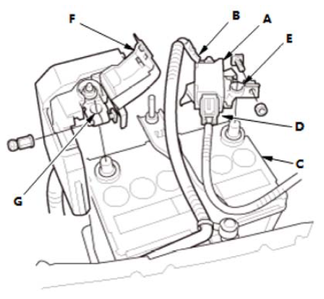 3.打开盖(F)。 4.从12 V 蓄电池上断开正极端子 (G)。