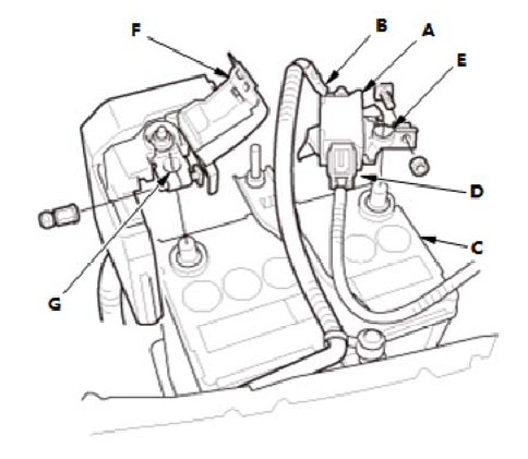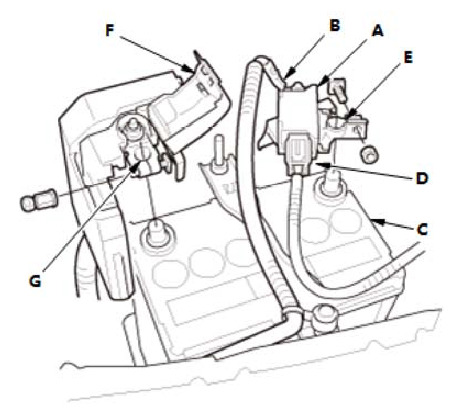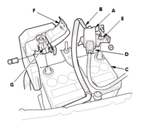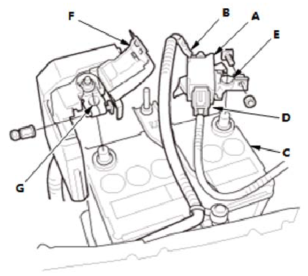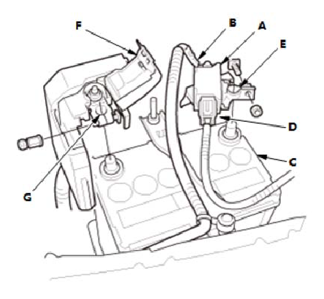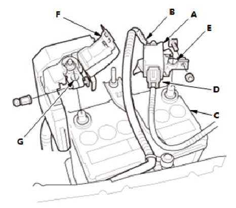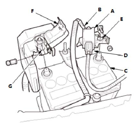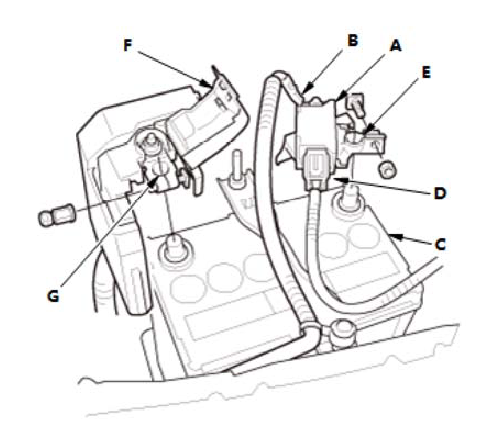 3.打开盖(F)。 4.从12 V 蓄电池上断开正极端子 (G)。