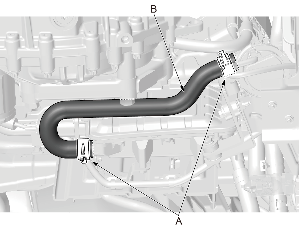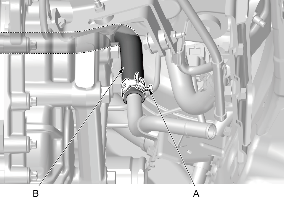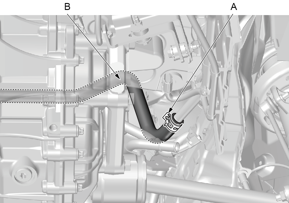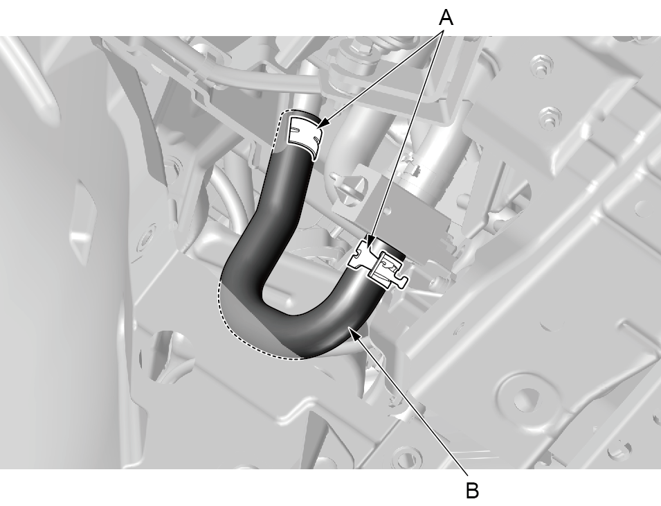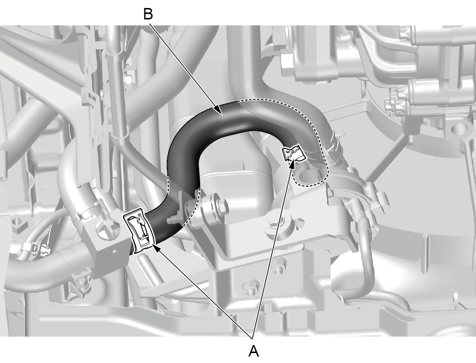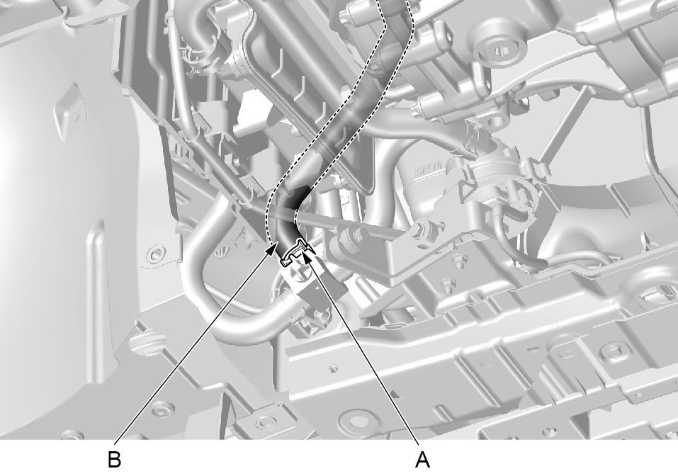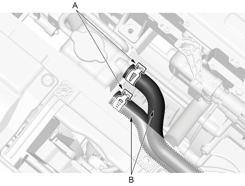 1.使用水管卡箍拆装钳脱开暖风膨胀水箱出水管与暖风系统三通固定卡箍(A)。 2.旋转脱开暖风膨胀水箱出水管(B)。