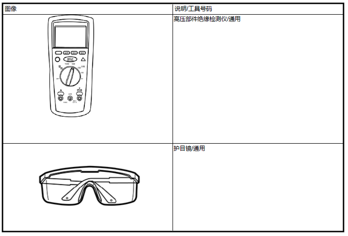 | 1. 在维修时必须佩戴高压绝缘手套/ 高压绝缘安全服/ 高压绝缘鞋/安全帽,并使用绝缘工具以防触电。 |