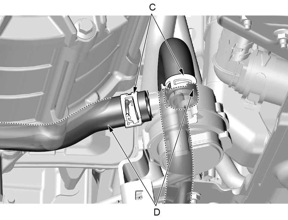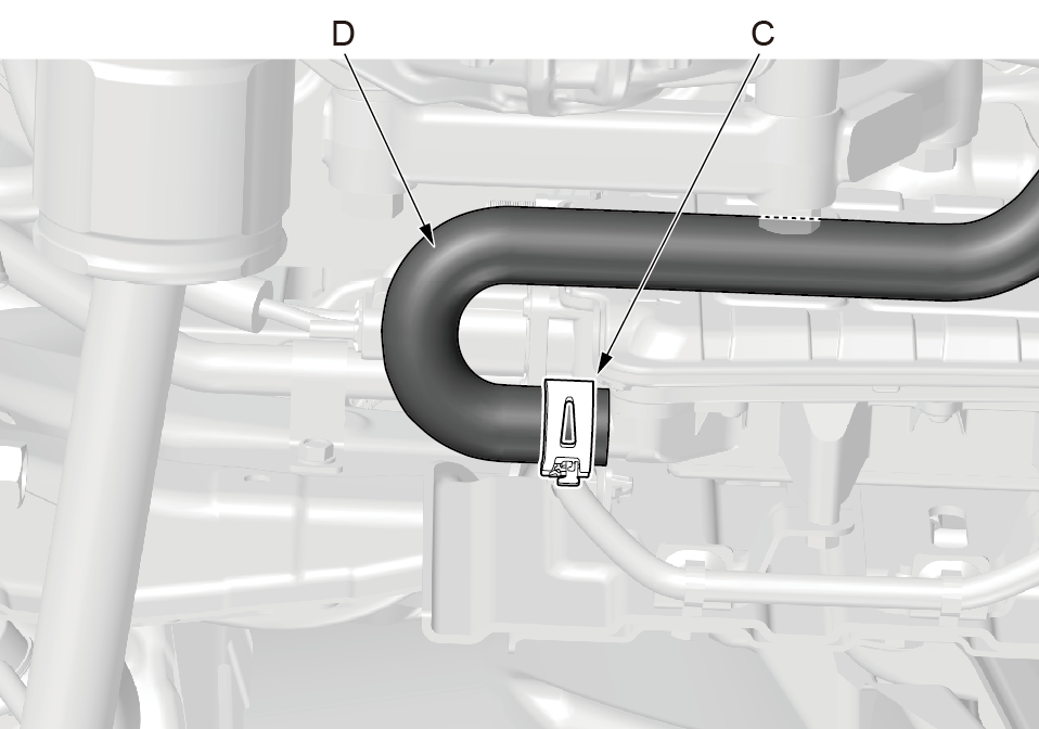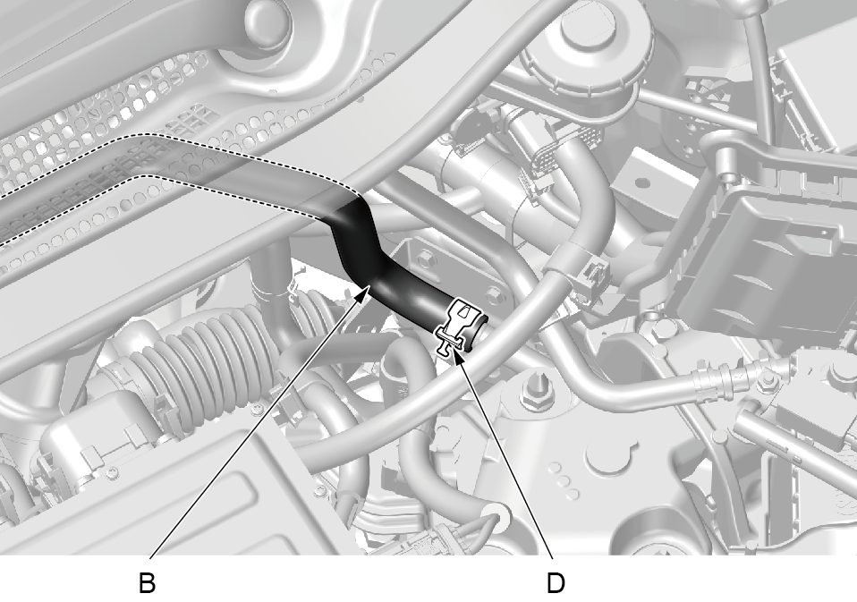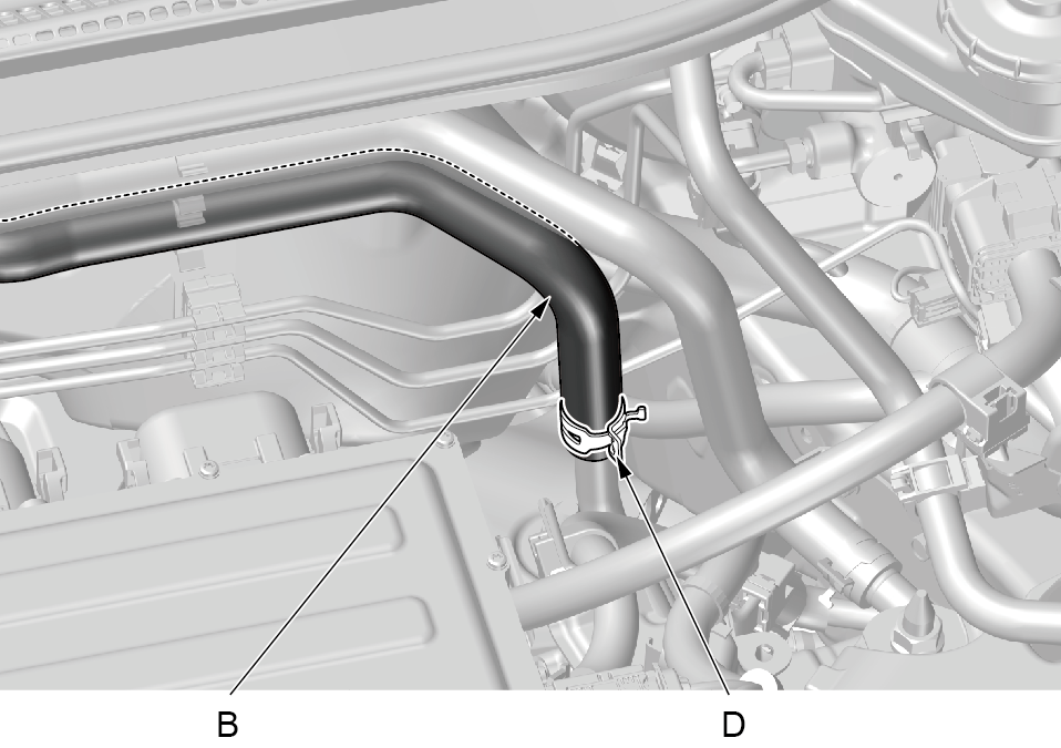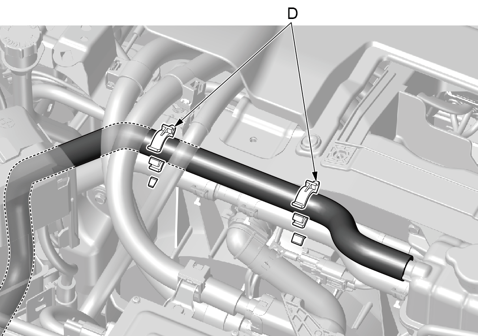 5.脱开暖风系统膨胀水箱进出水管卡夹(D)。 |
