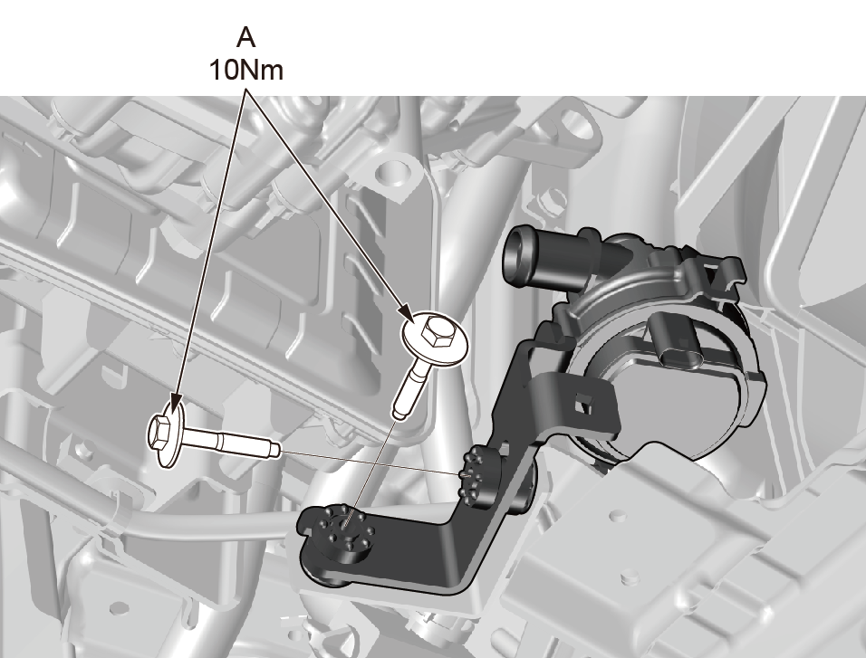 1. 用内饰件工具脱开暖风水泵线束与暖风水泵支架固定扎带(A)。 2. 用 10mm 套筒拆卸暖风水泵支架与白车身固定螺 |