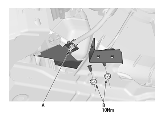 1.使用10mm套筒拆卸暖风系统PTC支架上的固定螺栓 (A)。 2.使用12mm套筒拆卸暖风系统PTC支架固定螺栓(B)。 |