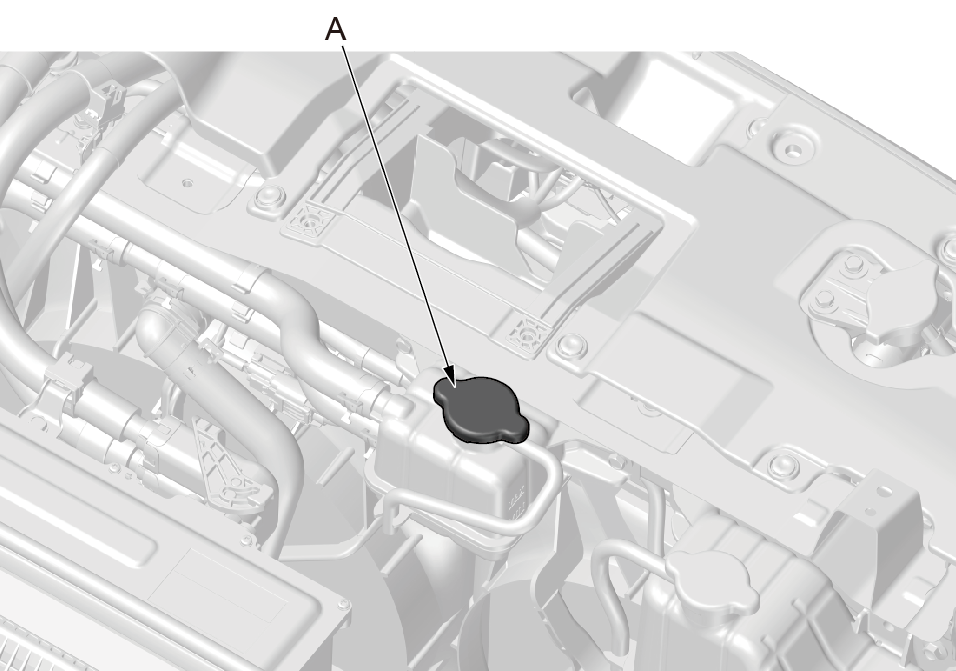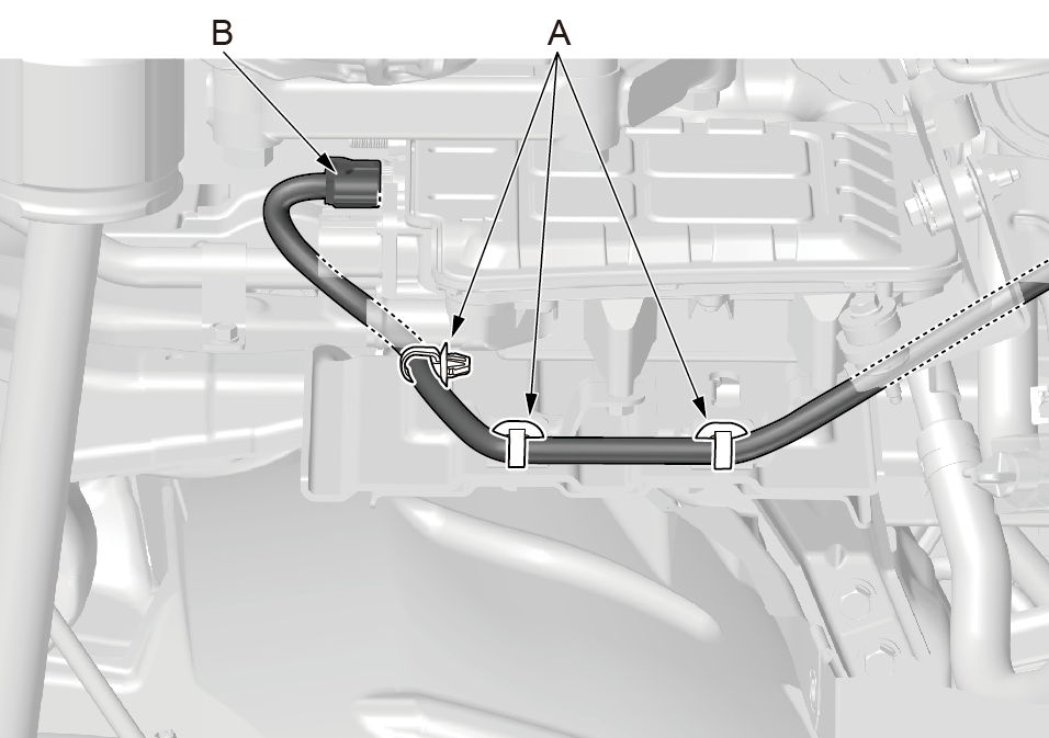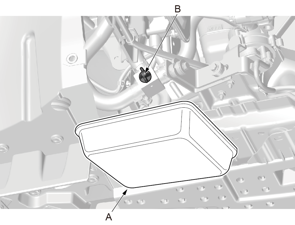 1.将集液盆(A)放置在暖风系统冷却液排液口下方。 2.打开暖风系统冷却液螺塞 (B)。 3.排出暖风系统冷却液后,拧紧冷却液螺塞(B)。