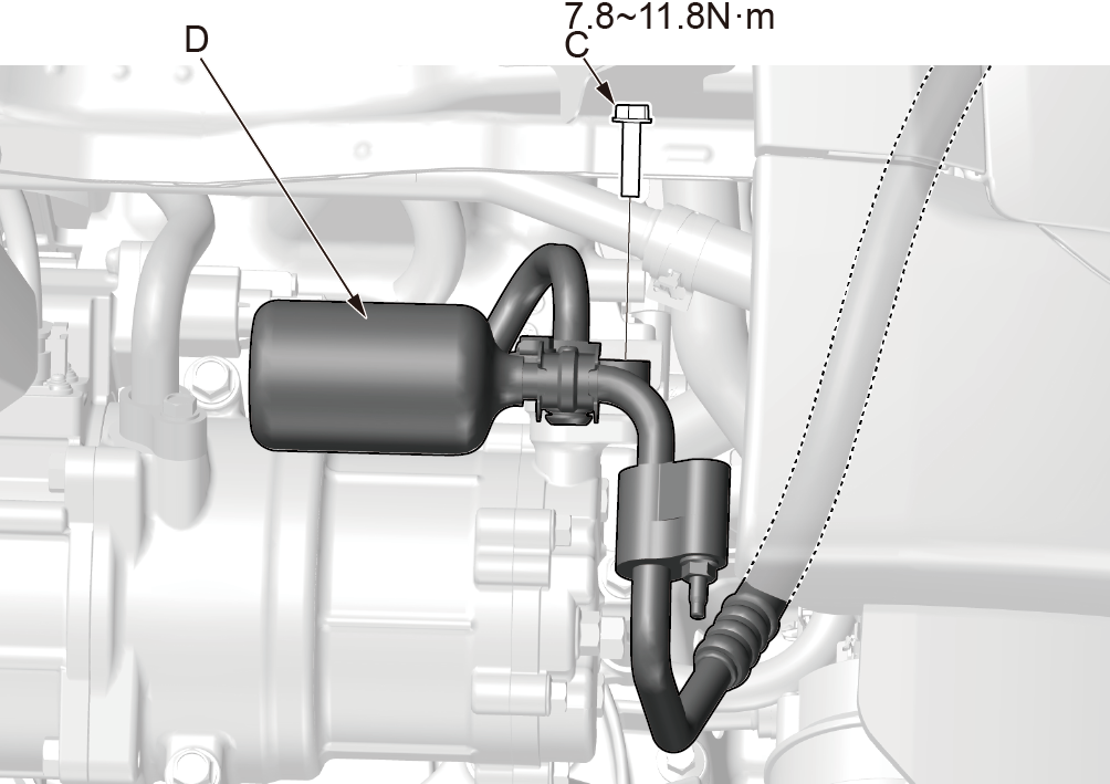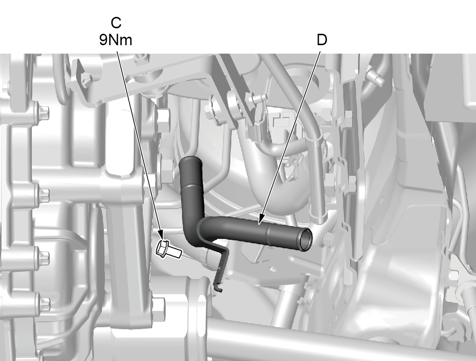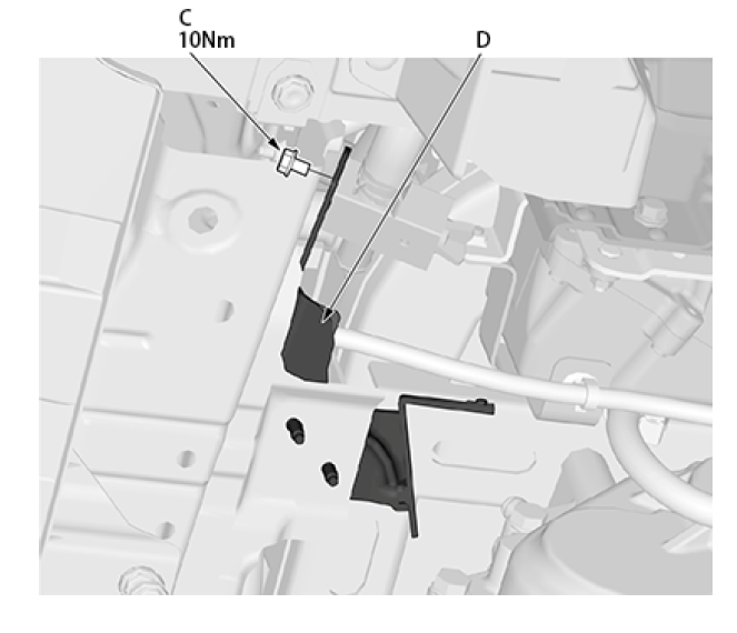 2. 使用 10mm 长套筒扳手拆卸空调电动压缩机高压管固定螺栓 (C)(M6×25),脱开空调电动压缩机高压管(D)。
