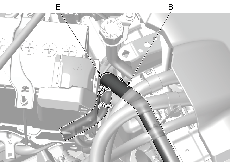 6.脱开暖风系统膨胀水箱水管卡夹(E),并取下暖风膨胀水箱出水管(B)。