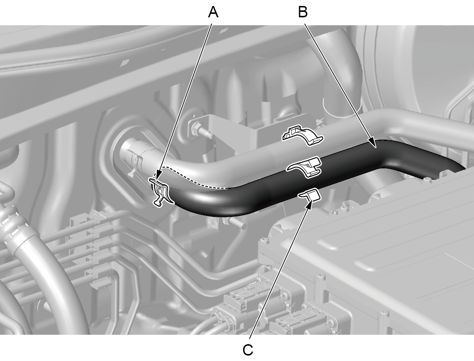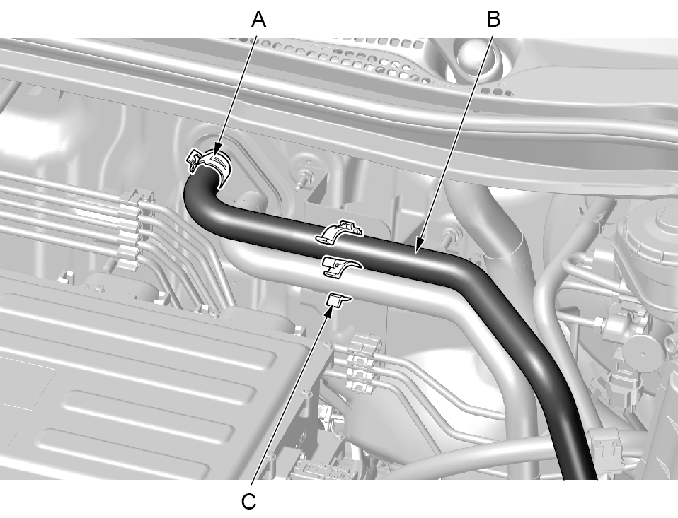 1.使用水管卡箍拆装钳脱开加热芯进水管与加热芯连接固定卡箍(A)。 2.旋转脱开加热芯进水管(B)。 3.脱开加热芯进水管固定卡夹(C)。