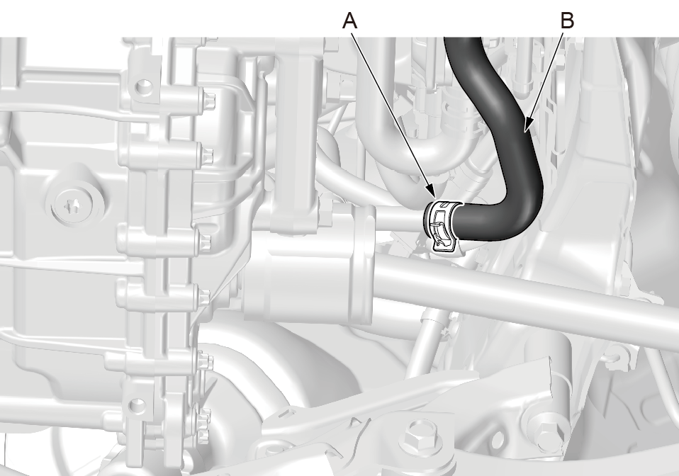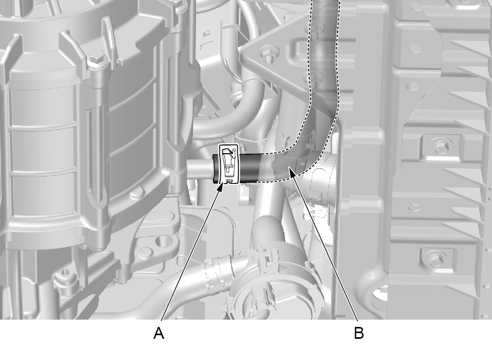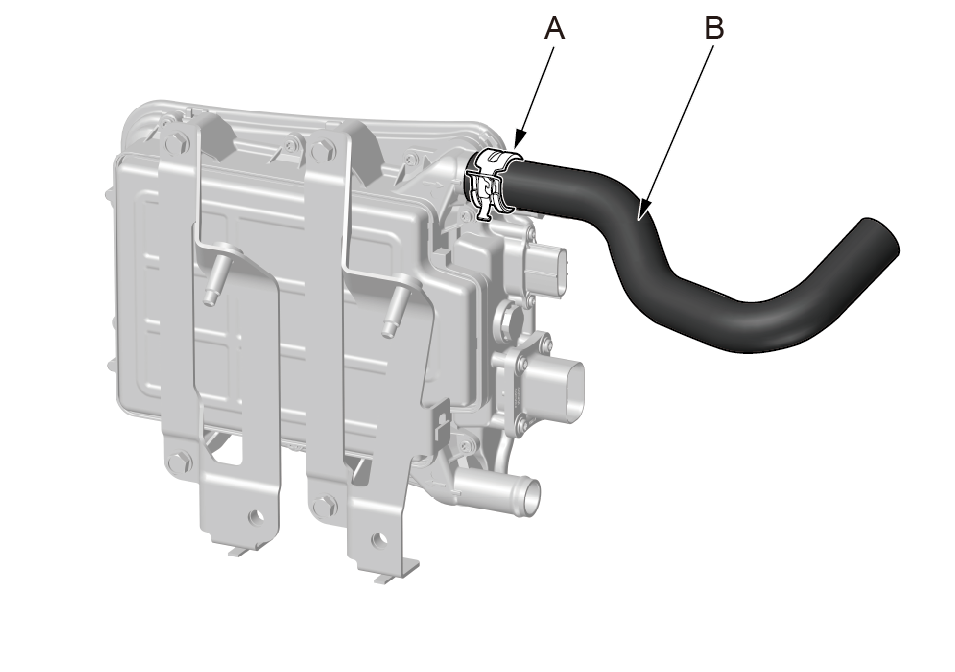 1.使用水管卡箍拆装钳脱开暖风加热器PTC出水管与暖风加热器PTC固定卡箍(A)。 2.旋转脱开,并取下暖风加热器PTC出水管(B)。