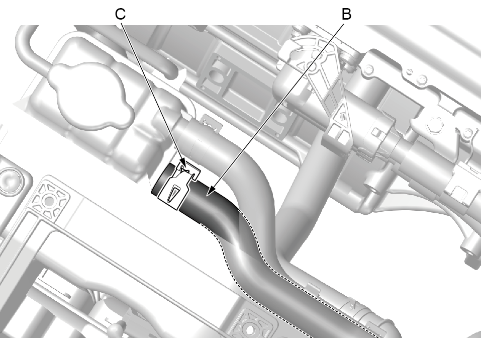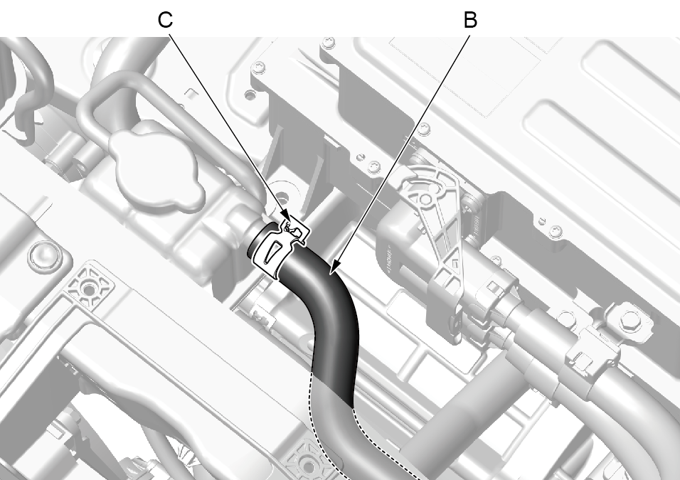 3.使用水管卡箍拆装钳拆卸暖风系统膨胀水箱进水管与膨胀水箱固定卡箍(C)。 4.左右摇晃脱开暖风系统膨胀水箱进水管(B)。