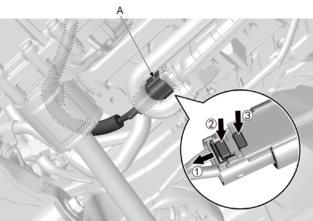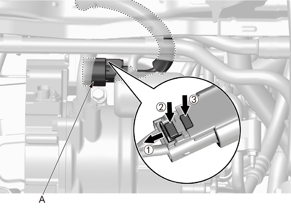 1.向后拨开锁止卡扣①,按压锁止卡②,脱开插接器直至插接器再次锁止,再次按住插接器锁止卡③,脱开空调电动压缩机电缆插接器(空调电动压缩机端)(A)。 |