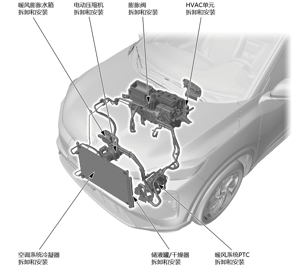 暖风系统加热器 PTC 出水管的拆卸和安装 |
