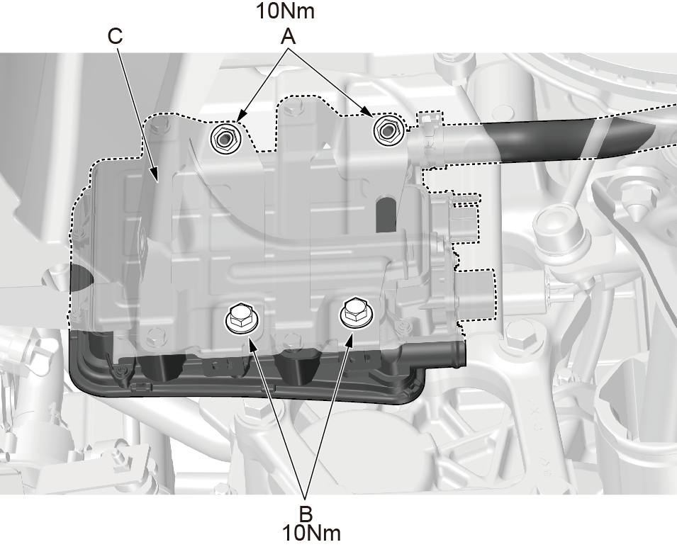1.使用 12mm 套筒拆卸暖风PTC 固定螺母(A)。 2.使用 12mm套筒拆卸暖风PTC 固定螺栓(B) 3.取下暖风系统PTC带进水管总成 (C)。