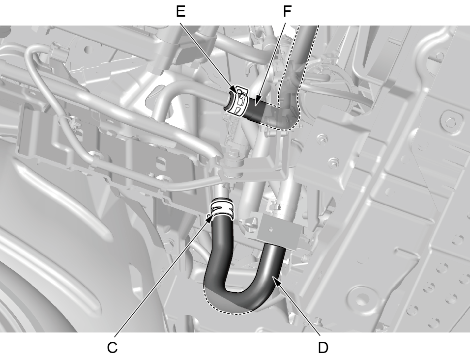 3.使用水管卡箍拆装钳脱开加热芯三通金属出水管与暖风系统三通水管固定卡箍(C)。 4.旋转脱开暖风系统三通水管(D)。 5.使用水管卡箍拆装钳脱开加热芯三通金属出水管与暖风膨胀水箱进水管连接固定卡箍(E)。 6.旋转脱开暖风系统暖风膨胀水箱进水管(F)。