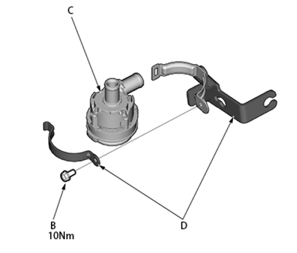 3. 用 10mm 回力扳手拆卸暖风冷却系统冷却液放水 阀与支架固定螺栓(C)。 4. 取下暖风水泵支架 (D)。 |