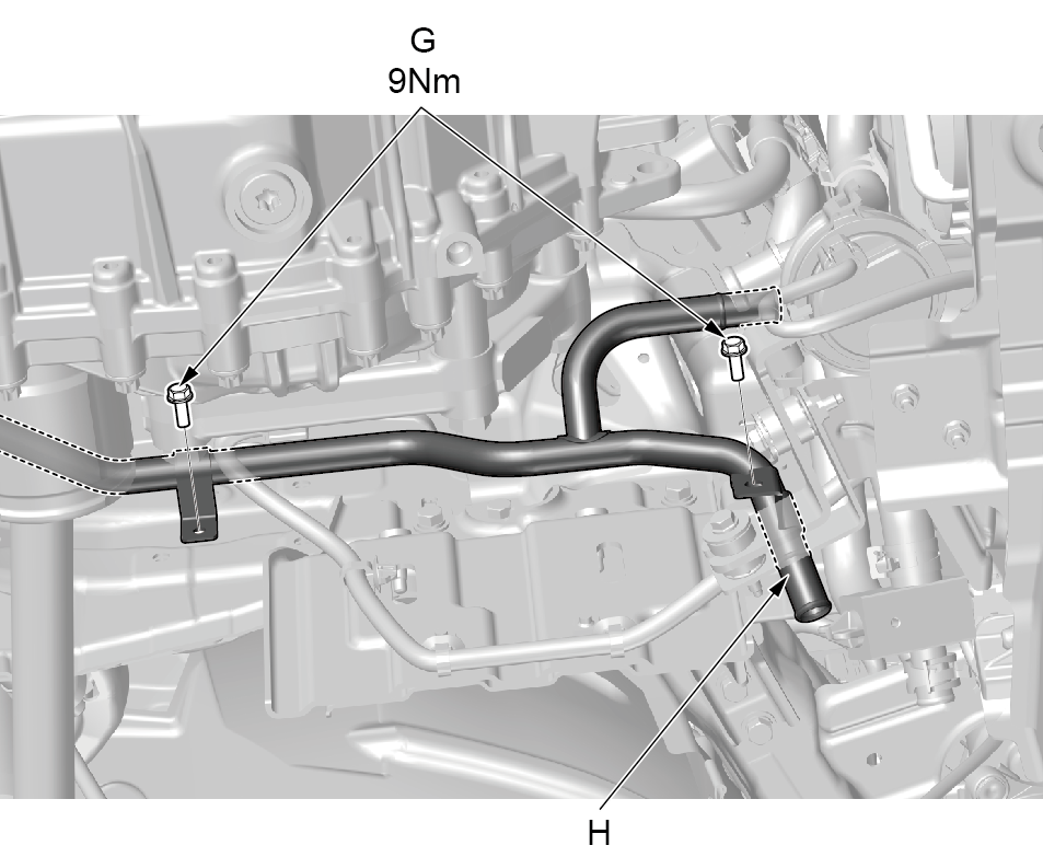 7.使用 10mm 套筒或扳手拆卸加热芯三通金属出水 管与车身固定螺栓(G),取下加热芯三通金 属出水管(H)。