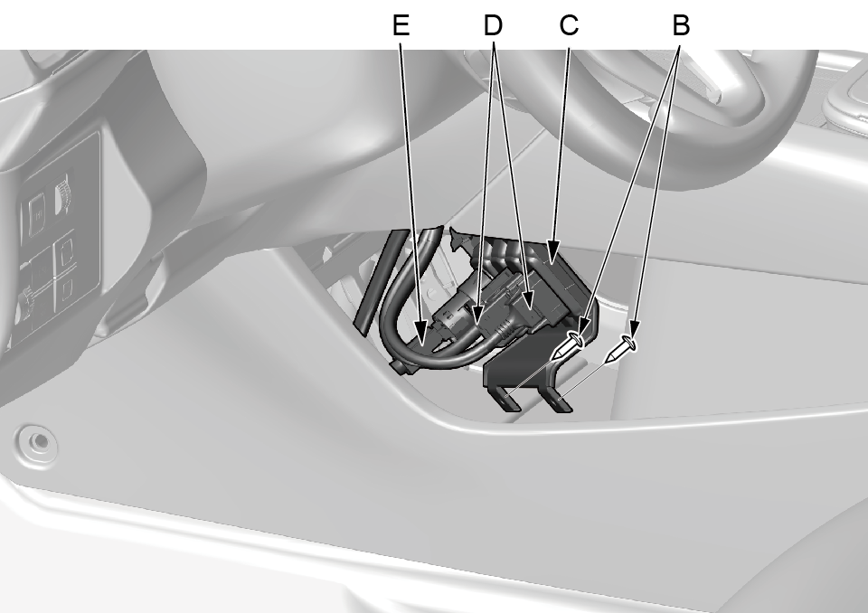 4. 使用10mm套筒拆卸远程信息处理单元支架固定螺栓(C)。 5. 取下远程信息处理单元(D)。 |