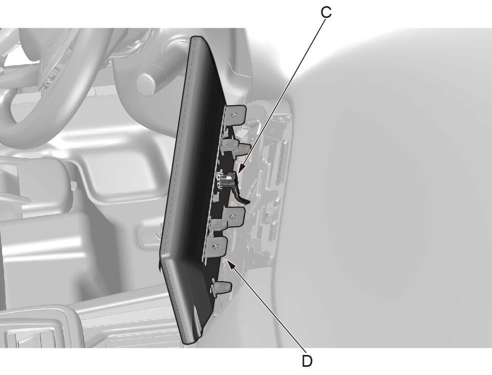 3. 使用内饰件拆卸工具撬开中控液晶屏(D)。 4. 脱开插接器(C)。 5. 取下中控液晶屏(D)。