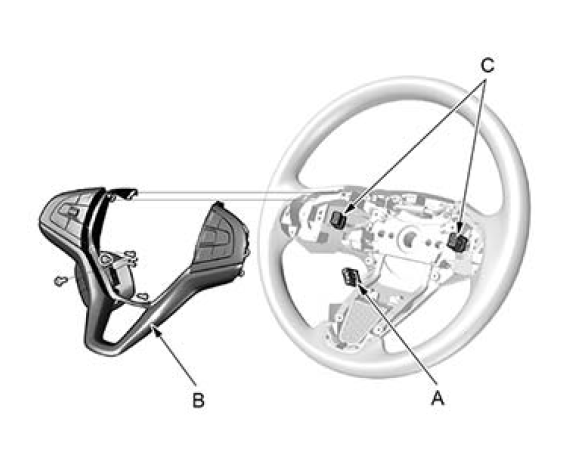3.断开插接器(A)。 4.拉出下装饰件总成(B)。 5.断开插接器(C),然后拆下下装饰件总成。 |