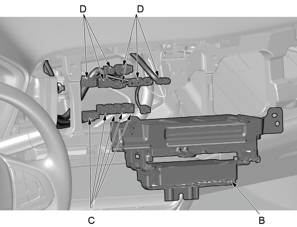 3. 向外拉出翻转音响单元总成(B)。 4. 脱开远程信息处理单元插接器(D)。 5. 脱开音响单元插接器(C),取下音响单元总成(B)。 |